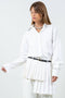 ASYMMETRICAL PLEATING COLLARED SHIRT 100% POLYESTER MODEL IS WEARING SIZE XS
